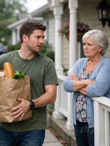 By the time I turned onto Maple Street that Wednesday afternoon, the paper handles of the grocery bags had already carved red grooves into my fingers, and all I wanted was to get inside, put the milk in the fridge, microwave whatever could be microwaved in under three minutes, and pretend the week wasn’t dragging me across concrete by the throat. The sky hung low and colorless above the row of houses, not quite threatening rain, just threatening mood, and the whole neighborhood looked as though it had exhaled and then forgotten how to breathe back in. Mrs. Halvorsen was standing on her porch before I even reached the walkway to my own house, planted there with the rigid expectation of someone who had been waiting specifically for me and was annoyed by the time it had taken me to arrive. Her cardigan was buttoned wrong, one side pulled higher than the other, but her arms were folded with such authority that the mistake only made her look more severe. She had the expression she reserved for the mailman when letters arrived damp, for the teenagers who parked too close to her hydrangeas, and for me whenever my grass grew half an inch higher than what she considered respectable.