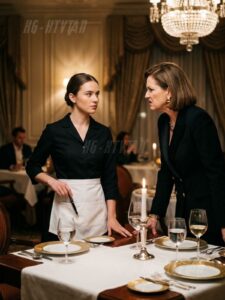 The silence that followed was deafening, not merely the hush of a dining room, but the kind of stillness that seemed to drain the air from an expensive restaurant in Manhattan. Forks froze midway to mouths. A waiter three tables away stopped pouring a vintage Cabernet. Every head turned toward the woman in the crimson Valentino dress who had just screamed at a young waitress.